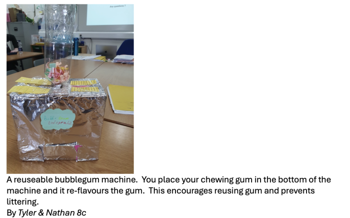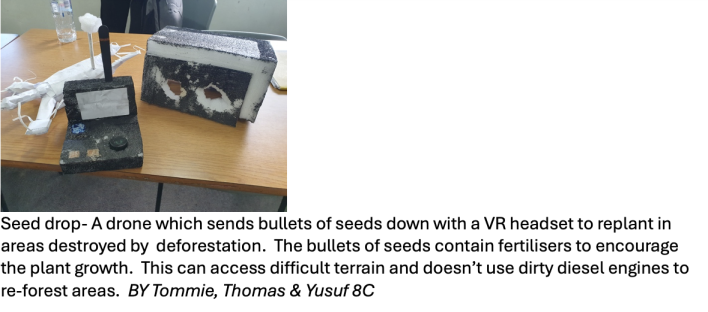 Year 8 have been working on creating a sustainable invention as part of their 'my world, my responsibility' topic. They have worked exceptionally hard and have created inventions ranging from solar powered hair straighteners to a seed dropping drone to an electricity producing fishing rod that only catches overpopulated fish. They not only designed these inventions, but they have created a model out of recycled materials and pitched them to the class, with some proving they would get many investments from their classmates!